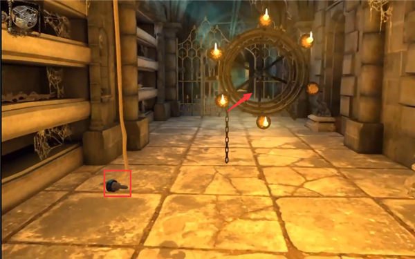 8、向上拖动机关,左侧绳子落下,点击左侧绳子。