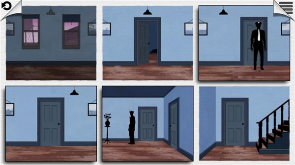 随后来到了第三个场景,倒霉的主人公在众多的房间当中穿梭,却不料RP不好,乱了阵脚,被守株待兔的警察给逮了个正着……如果我们按照下图移动插画的位置,主人公的RP爆表,错过了警察之后便可以从楼梯逃走。小编也不知道怎么回事,自从玩了致命框架攻略之后也忍不住站在了我们的主人公这边,明知与警察作对实则不对,却还是忍不住为逃过一劫又一劫的黑衣人拍手叫好。