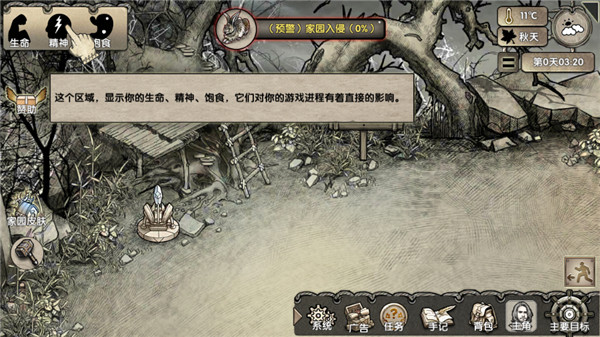6、这个区域会显示你的生命、精神、饱食,他们对你的游戏进程有着直接影响。