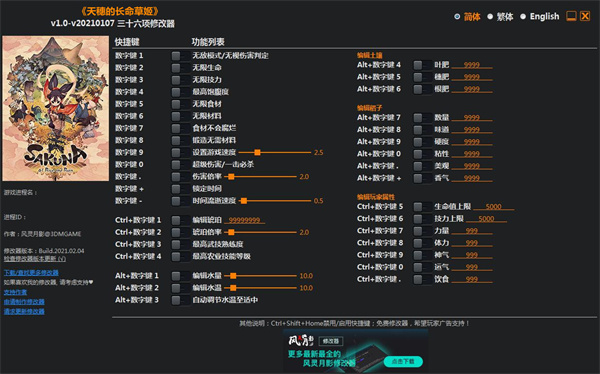 天穗的长命草姬是一款将农场与战斗相互结合的全新挑战游戏,游戏中玩家将扮演可爱的小萝莉,为了寻找种子到处探索新地图,保卫家里的稻田,利用各种农具击败各种怪物,除了养成系统还将拥有武器锻造和料理系统以及迷宫探索等经典要素,战斗系统做的相当不错,人物动作流畅设计合理,游戏画面也十分可爱。由于游戏对新手比较困难,所以小编为大家带来一款天穗的长命草姬三十六项修改器,该修改器包括无敌模式/无视伤害判定、无限生命、无限技力、最高饱腹度、无限食材、无限材料、食材不会腐烂、锻造无需材料、设置游戏速度、超级伤害/一击必杀、伤害倍率、锁定时间、时间流逝速度、编辑琥珀、琥珀倍率、最高武技熟练度、最高农业技能等级、编辑水量、编辑水温、自动调节水温至适中等三十六项功能,大大减低游戏难度,帮助用户更好的体验游戏,有兴趣的小伙伴快来下载体验吧!