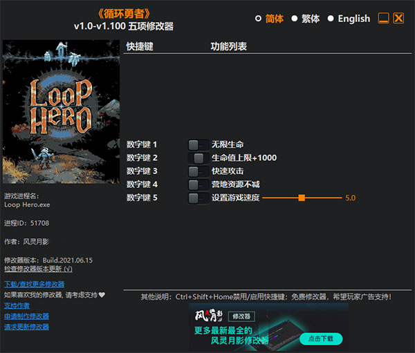 循环英雄是一款带有rogue与卡牌元素的策略角色扮演游戏,每次冒险过程都是随机生成世界的循环一轮,如此不断获得装备、解锁技能和卡牌,以及扩建你的营地。游戏在打怪升级之外加入营地支援的元素,体验随机性、策略性与角色变强的乐趣,非常的极具趣味性。为了玩家可以更好的进行游戏,所以本次小编为大家分享的是循环英雄五项修改器,该修改器是游侠制作组专门针对循环英雄这款游戏制作的游戏辅助,修改器界面简洁明了,使用方便快捷,玩家只需启动游戏打开修改器即可,玩家可根据自身的需求进行修改属性,利用该修改器玩家可以修改无限生命、生命值上限+1000、快速攻击、营地资源不减和设置游戏速度五项功能,帮助你获得更好的畅玩游戏,有喜欢这款游戏的玩家那么千万不要错过这款修改器,快快到本站下载体验吧。