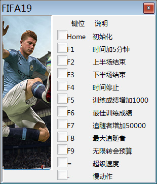 FIFA 19十一项修改器是专门针对游戏FIFA 19制作研发的一款全版本修改器,这个修改器功能非常的强大,可支持所有版本,并且能够修改游戏内的各种数据,比如可以让时间加5分钟、上半场结束、下半场结束、时间停止、无限转会预算等十一项修改功能,帮助玩家轻松掌控赛场,轻松获得最佳的游戏极致体验。FIFA 19作为一款由EA制作Electronic Arts发行的足球体育类游戏,是人气系列《FIFA》系列2018年最新的正统续作,并加入了欧冠,更有着著名配乐大师汉斯季默的参与。游戏中的生涯模式和终极球队都可以玩到冠军联赛,前作的终极球队模式回归,同时玩家可以组建自己的梦之队。该游戏继承前作的基础技术和核心内容,加入更多的俱乐部和球星,在细节方面进行更好的优化,并且还会有更多的创新元素,保证游戏的新鲜度。本作保持系列一贯的高水准,给玩家带来最棒的足球游戏体验。