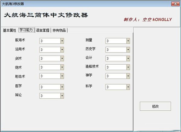 大航海时代3修改器是专用于一款自由度极高航海冒险类游戏大航海时代3的游戏辅助工具,玩家可以利用这个修改器在游戏中进行多种的数据修改,例如修改基本属性、学习能力、语言掌握、持有物品等等属性,可以帮助用户更好的去玩游戏,大大降低了游戏的难度系数,提高自己的游戏体验。有需要的玩家可以到此下载。