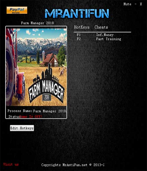 农场经理2018修改器是针对热门主机游戏《农场经理2018》量身打造的一款游戏辅助软件。这款修改器完美适配与V1.0版本。该软件为玩家提供无线金钱,和即时培养两个大功能,帮助玩家更加轻松的玩农场经理这款游戏,更好的提高玩家的游戏体验感。有需要的玩家快来下载体验吧!
