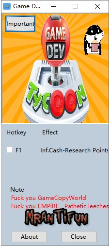 游戏发展国修改器是专为热门游戏《游戏发展国(Game Dev Story)》量身打造的一款辅助修改软件,它适用于目前游戏1.6.12版本,能够为你带来无限金钱、无限研究点数两项功能,帮助你减轻游戏的负担,给予你最佳的游戏体验,但为避免游戏乐趣和本质的遗失,请大家不要过度修改使用。