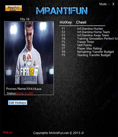 FIFA18九项修改器该游戏是由EASports开发的一款功能强大的足球体育类游戏,是人气系列《FIFA》系列的最新续作。游戏将会引入“传奇球星”作为多平台的招牌(Icons),根据EA的信息,招牌将会在各平台推出,首个巴西传奇球星将为罗纳尔多。更多FUT终极队伍招牌还会在今年夏季推出。游戏将分成三个版本,标准版、罗纳尔多版、以及招牌版。罗纳尔多版将包含提前3天享受游戏的福利,而招牌版将会提供一些附加的FUT内容(以租借球员的形式),该版本也可以享受提前三天游戏。《FIFA 18》继承前作的基础技术和核心内容,加入更多的俱乐部和球星,在细节方面进行更好的优化,并且还会有更多的创新元素,保证游戏的新鲜度。另外小编推出一款和游戏同名的修改器,主要有无限耐力,无限团队耐力,冻结时间,无限技能积分,玩家最高评分等九项修改器功能,功能强大适合初级玩家进行游戏体验。(不要破坏游戏规则,会影响游戏体验感的)