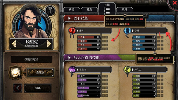 可用的对象,升级的技能,升级的字符,性格特征…