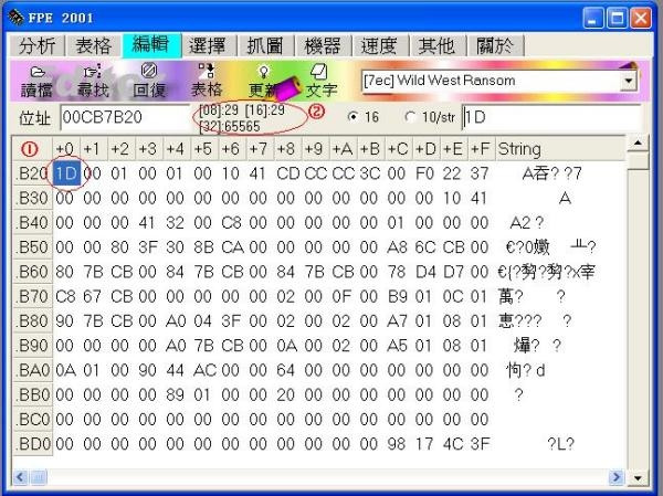 7、选Edit进入内存页面编辑。如下图如果您有兴趣分析这些数据之间的关系,则可以进入这个页面来手动进行修改。不过,这一步不是一般新手可以做到的,因为稍微修改错误就可能导致游戏程序关闭。