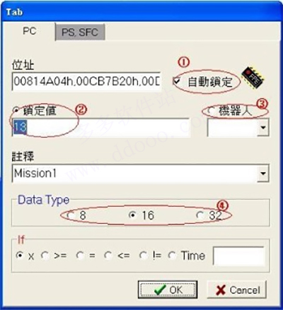 6、选Add直接进行该字节段的修改。如下图,①处自动锁定打√则表示一直锁定这个数据;②处是写入您想把找到的数据修改成的值,为10进制;③机器人前面打√,则表示按选择的快捷键来修改为锁定的数据;④选择写入的数据所占用的字节。