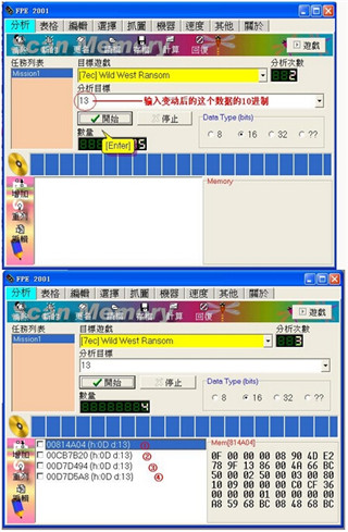 此项功能就是修改游戏中的数值。启动软件后,在游戏中按热键(和以往一样默认按键为NUM *)激活FPE2000,软件将立即中断游戏并切换至窗口界面。当目标游戏中显示当前所运行的游戏名称时就可以进行游戏修改了,点击任务列表中的一个任务,在工具栏中选择更名,填入你要修改的数值的名称,比如HP、MONEY 等。完成后,你就可在分析目标中填入你所要查找的数值,然后点击开始按钮,开始查找,查找完毕后,屏幕下方的窗口中显示找到的地址列表,如果找到地址太多就显示不出来。上面的小窗口显示找到地址的数量。因第一次查找到的地址很多,我们先暂且回到游戏,按屏幕右上角的游戏按钮即可返回游戏,当你所要查找的数值变化后,再次按热键激活FPE2001 ,把变化后的数值填入分析目标中,再按开始按钮,这次找到的地址应只有一个了(如果这时地址不只一个再回到游戏中,等数值变化后再查找),用鼠标双击地址列表中所找到的地址,自动切换到表格功能并出现一个新的窗口,在锁定值中填入你想要的数值,当然是多多益善了,再点击OK就可以了,如在锁定字样上打勾,那么修改后的数值就不会再变了,笔者建议不要用锁定,以避免不必要的麻烦。如果你玩格斗游戏很“面”的话,它提供的低端分析功能可以帮助你,格斗游戏是以血来表示生命的,你只要在第一次查找时填入“?”,第二次如血多了就填“+”,血少了就填“-”,如此反复即可,因为血是以模拟量表示,所以查找次数相应的就会比查找金钱时多很多。另外,该软件一样也能同时查找多个数值,最多24组数值。只要在任务列表上面的工具篮中点一下新的,就有一个新的任务显示在任务列表中。最后说一句,在填入锁定值时切记不要太贪心,否则……