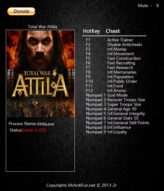 阿提拉全面战争是由SEGA公司发行的一款策略战棋游戏,该游戏的背景在公元四世纪末年,罗马帝国已经被分为东西两部,而真正的威胁其实来自于远东的阿提拉,这位颇有雄才大略的领袖将带领匈奴骑兵一路西进,摧毁一切胆敢挡路的势力。玩家要扮演一路“螳臂当车”的君主,努力准备防守并不惜一切代价阻止阿提拉的入侵。在游戏中,玩家可以可以选择坚壁清野,自行毁掉所有可能帮助敌人的资源,甚至可以选择摧毁城池并撤退。此外,游戏的战斗效果都得到优化和增强,可以看到更为真实的战斗场面以及场景细节,可以说是一款非常好玩的策略战棋游戏。虽然好玩,但游戏的难度还是略大,为此小编带来了阿提拉全面战争十九项修改器,该修改器是由大佬MrAntiFun原创制作,可以修改游戏内各项属性,包括无限金钱、无限移动力、瞬间完成科技、无限经验等十二项游戏内容,能够降低游戏难度,提升游戏体验。有需要的玩家欢迎免费下载使用。