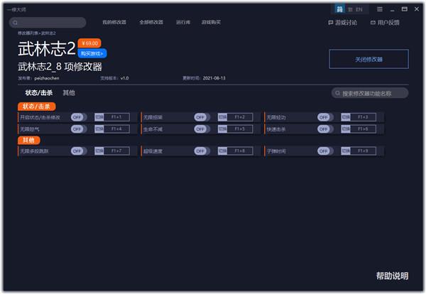 武林志2是一款武侠题材的沙盒动作冒险RPG游戏,游戏讲述的即是主角联合武林各路英雄豪杰驱逐外域武林,开创新门派,重整中原武林秩序的故事,游戏采用全即时战斗模式,玩家将扮演江湖上最出名的杀手,联合武林各路英雄豪杰驱逐外域武林,重整中原武林秩序,但达成目的的方法全凭玩家自己决定。而为了增加玩家的游戏体验,小编特地为大家分享一下武林志2修改器,该修改器游侠制作组专门针对这款游戏制作的游戏辅助,修改器界面简洁明了,使用方便快捷,玩家只需启动游戏打开修改器即可。玩家可根据自身的需求进行修改属性,利用该修改器玩家可以使用修改击杀、无限招架、生命不减、无限怒气等八项修改功能,能帮助玩家得到更便捷的游戏体验。但小编还是建议玩家们适度修改,以免丢失游戏体验。有喜欢这款游戏的玩家那么千万不要错过这款修改器,快快到本站下载体验吧。