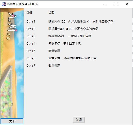 九州商旅修改器是专门为《九州商旅》游戏制作的一个辅助工具,由于该游戏上手困难,所以新手玩家刚接触游戏时一般很难操作,如果想初始体验好的话就可以借助这个九州商旅六项修改器。该修改器界面简洁清爽,操作使用方便,提供强大的修改功能,支持随机属性、好感度max,可以对游戏中的数值内容进行修改,并且完全的可以按照玩家自己的需要定制,从而降低游戏的难度,让玩家更快上手游戏,感兴趣的玩家可以来试一下这个九州商旅修改器!九州商旅是由BigLight.Games制作的一款独立的模拟经营类游戏,主要以贸易探索为主,并融合了经营与养成等多种玩法,玩家扮演的商人要招募会计、医生、领队、厨师之类来组建的商旅团队,大量游戏内容的不断开放给玩家带来一段完美旅程,许多创意的历险挑战给玩家带来完美的穿越之旅!
