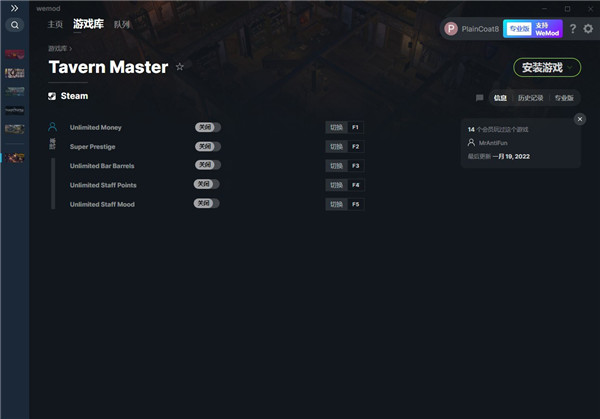酒馆带师五项修改器是一款专门提供给游戏《酒馆带师》的游戏内容修改工具。该游戏工具可以轻松修改游戏中的多项数值,其中不管是金钱,酒桶,还是员工心情等修改功能,都能够帮助大家更好的玩这款游戏,给大家更好的游戏体验。相信不少玩家可能都玩过这款养成类的酒馆带师,玩家独自经营起来也可能是比较麻烦,但是通过这款酒馆带师修改器就可以轻松完成玩家的目标,让大家快速解锁各种建筑和各种新的饮品。下文小编还提供了详细的使用教程,需要的小伙伴快来本站下载游戏体验一下吧。