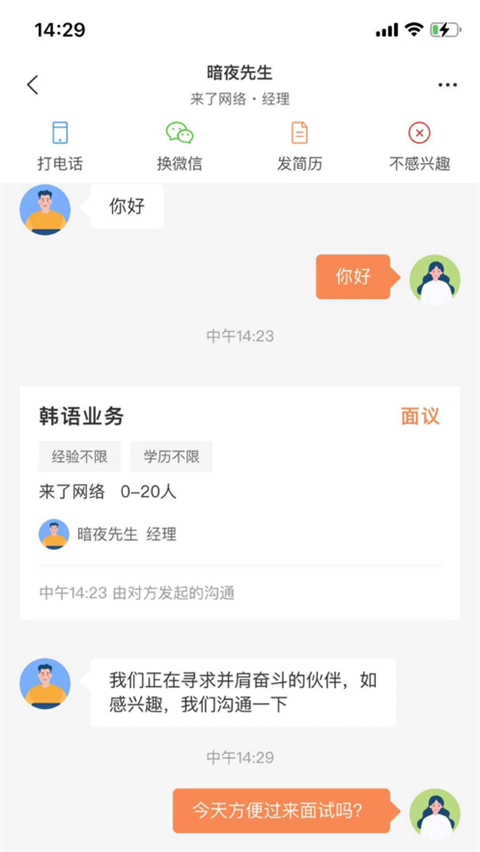 5、垂直招聘:求职者与BOSS在线直接聊天,缩短面试流程,减少面试时间。