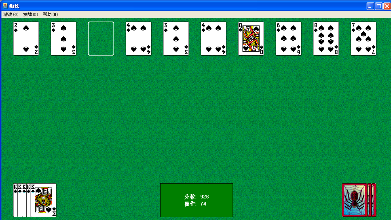 在"游戏"菜单上,单击"开局"开始游戏。牌面上有十叠牌,前四叠每叠6张,后六叠每叠5张,只有每叠的第一张正面朝外,其他均为正面朝内。界面的右下角有五组共计50张牌,没有全部翻开。windows xp版本中,界面的中下方的方框中显示的得分分数(开局为500分)和已操作数。vista版本中,没有该框,分数及操作数显示在界面的最下方。