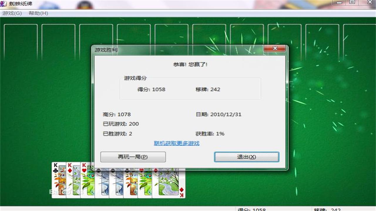同时该游戏也是Windows ME及后续版本所自带的小游戏,游戏的目标是以最少的移动次数将牌面中的十叠牌以及待发的五组,共计八副牌整理移除。当所有牌被移除整理到界面的左下方,游戏获胜。