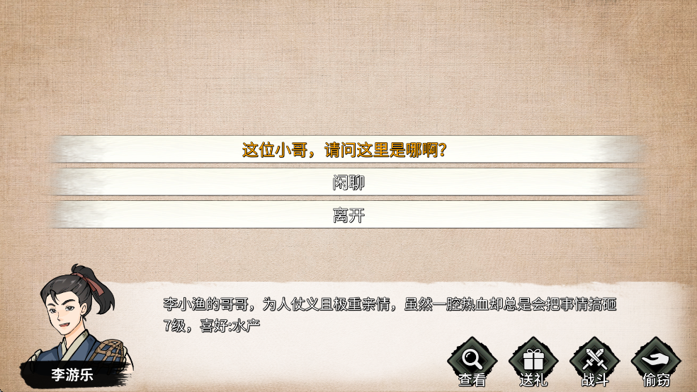 2、在角色互动界面,你可以进行对话送礼等操作,某些凶险的剧情战斗如果失败就会导致游戏结束,做任务时请多存档