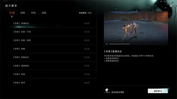 点击游戏主界面右下方的【竟技】按钮,进入【战斗教学】页面。在这里,你可以反复学习各种实用技巧。这些技巧分为初、中、高三级,共有22个教学关卡,从这里开始学习,成为异人高手吧!