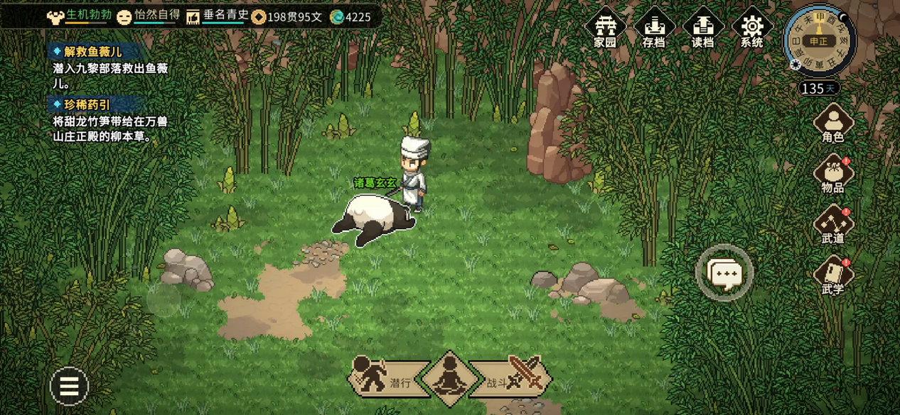 8.前往竹林拾取甜龙竹笋,战斗结束后可领养熊猫玄霜(驯兽5级);回到万兽山庄复命,再对话下唐婉儿;从正殿出去触发剧情,解锁花海;