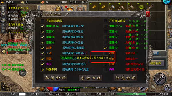 4、随着等级的提升那些打怪多出来的低级装备可以一键回收获得元宝