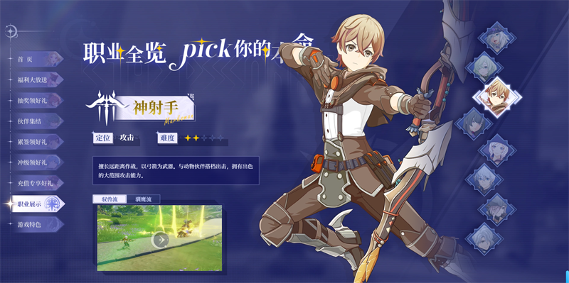 擅长远距离作战,以弓箭为武器。与动物伙伴搭档出击,拥有出色的大范围攻击能力。