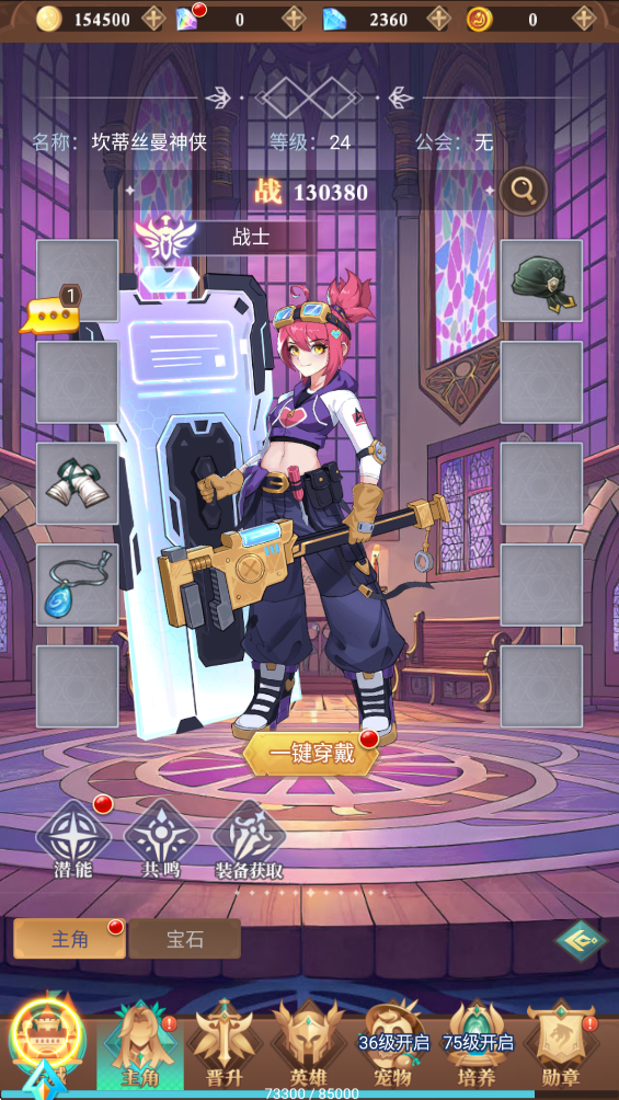 1、先对主角进行培养,一键穿戴装备,再对潜能进行升阶,达到80级后开启宝石镶嵌玩法
