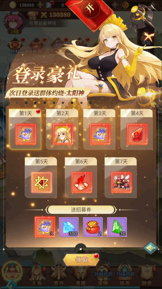 1、登陆到暮光召唤师游戏后先游戏的世界界面先登陆登陆福利,再到福利大厅领取签到奖励,然后前往酒馆通过高级招募获得专属英雄
