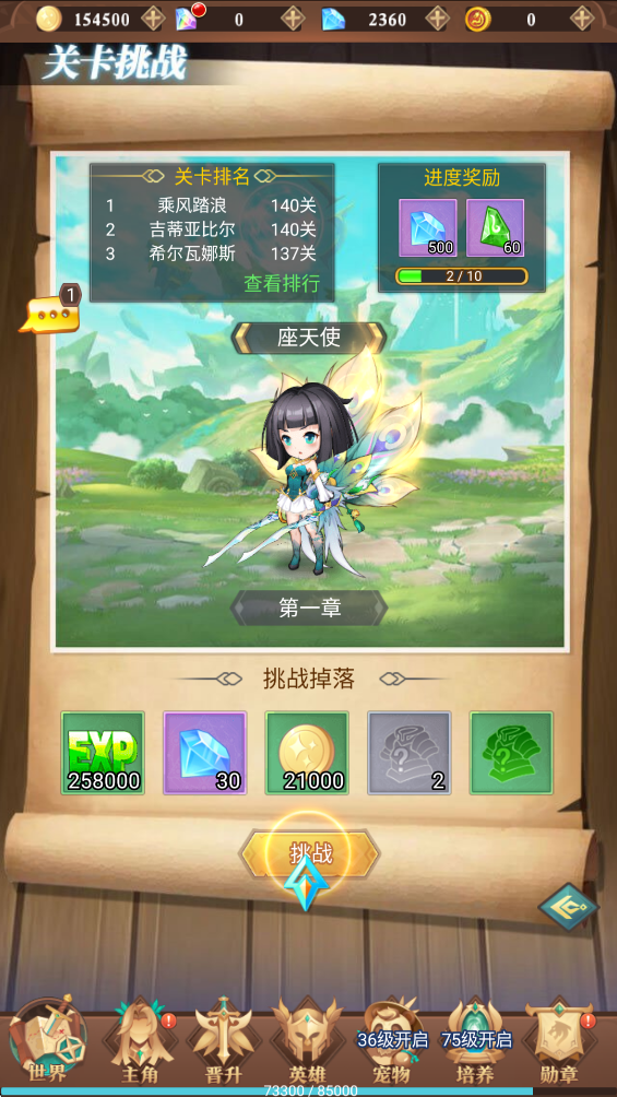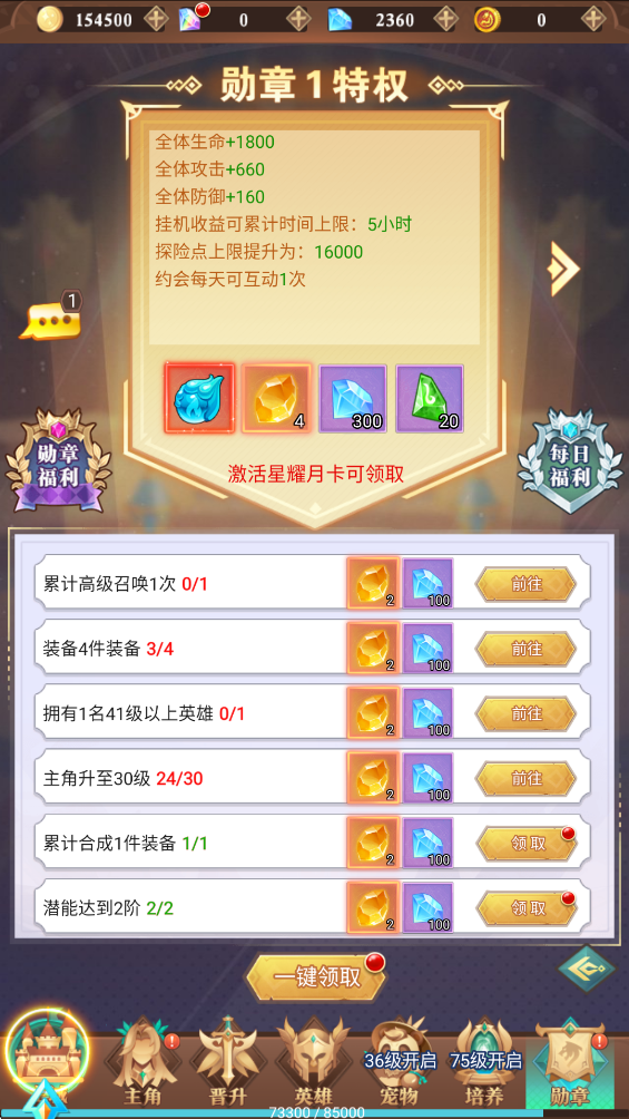 2、下面就是前往主线章节进行闯关挑战了,除了闯关可以提升等级之外,还可以通过挂机、日常活动来领取相应的升级经验奖励