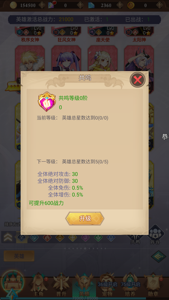 3、下面对已经上阵的英雄进行升级、突破、装配符石以及激活共鸣等操作