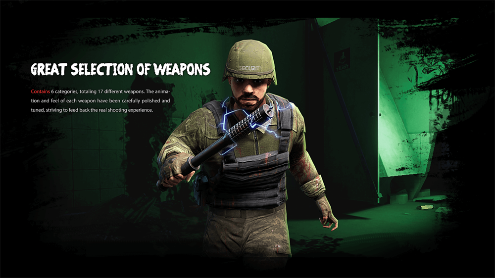 包含6大类别,共计17种不同武器。每把武器的动画效果与手感均经过精心打磨与调校,力求还原真实射击体验。