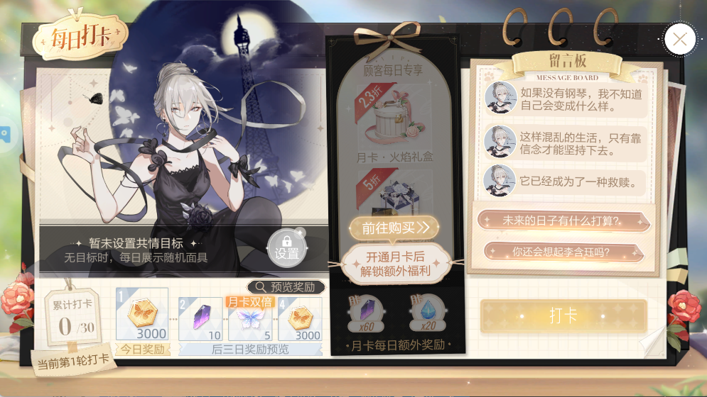 每日点击 “打卡” 领基础奖励,还能通过留言板互动提升角色好感,月卡可解锁额外福利。