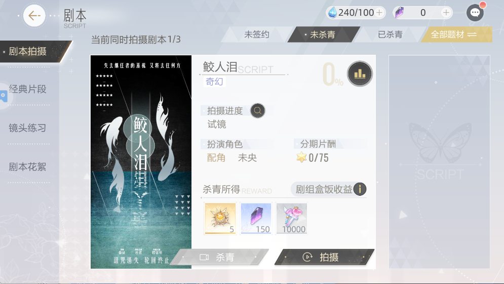 选择剧本后点击 “拍摄” 推进进度,完成试镜等环节可获得片酬与杀青奖励,同时提升演技。