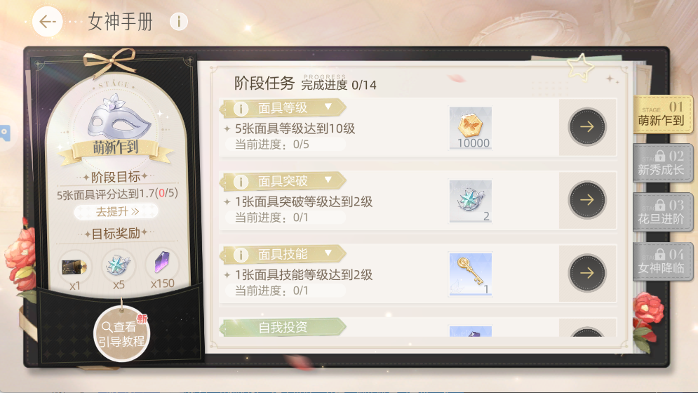 完成阶段任务可领资源,新手优先提升5张面具等级到10级拿奖励。