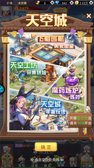 开服第二天且通关50关开启天空城,其包含【飞艇巡航、天空工坊等多种丰富玩法】。
