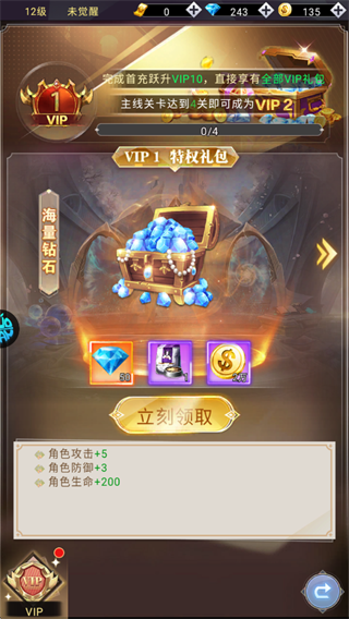 领取VIP1特权礼包,获取钻石、资源与属性加成,推进主线至4关可升级为VIP2以此类推。