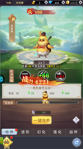 解锁宠物系统,通过培养、进阶、强化等提升宠物属性,宠物能为角色提供攻击、生命等属性加成。