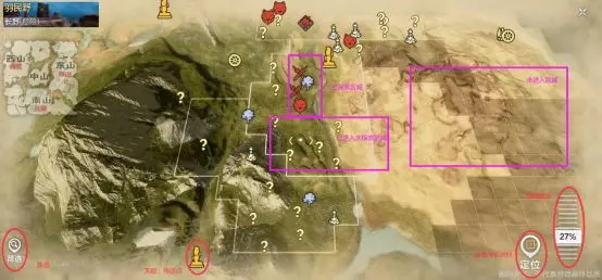 点击游戏界面最左上角打开地图,右下角缩放选项拖动即可调整地图比例,定位选项可以设定导航目的地。地图中当前尚未进入的区域不显示细节,已进入未探索的区域地图上会显示问号,问号经探索后会出现对性的图标,具体图标介绍还请移步主攻略部分查看。