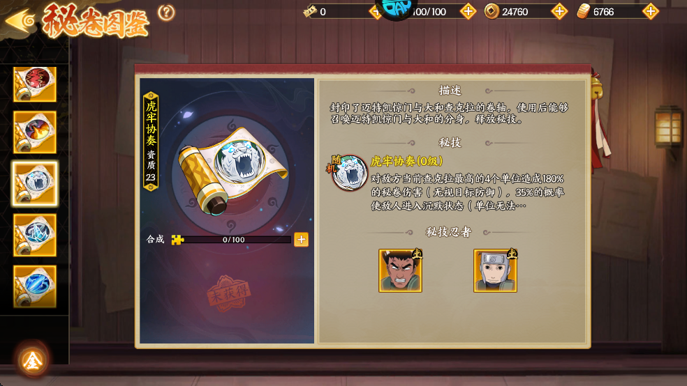 封印了迈特凯惊门与大和查克拉的卷轴,使用后能够召唤迈特凯惊门与大和的分身,释放秘技。