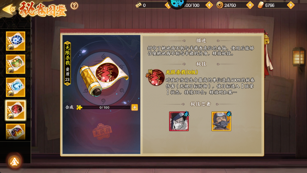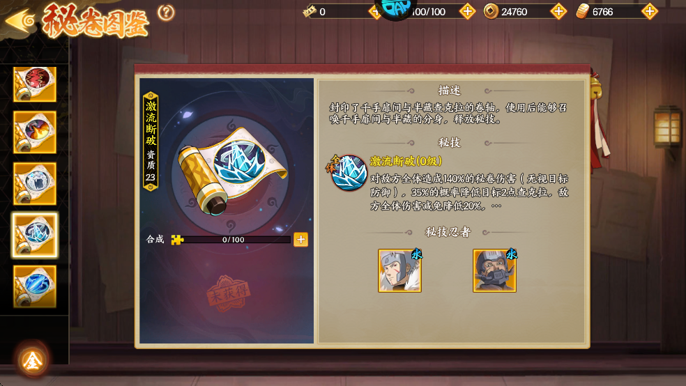 封印了千手扉问与半藏查克拉的卷轴,使用后能够召唤千手扉间与半藏的分身,释放秘技。