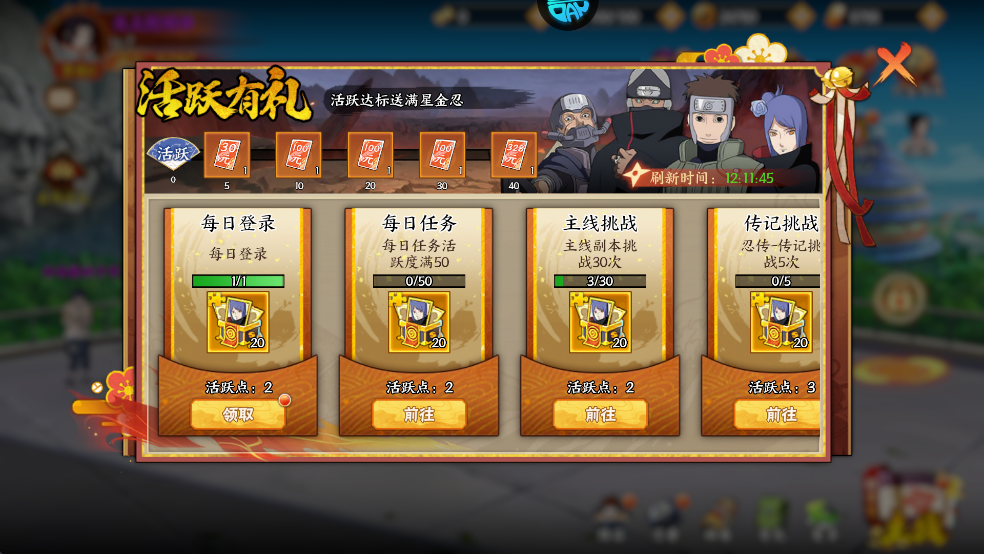 8、创角豪礼:创角立即领取木叶新三忍、海量金币与充值卡、助你速通主线副本