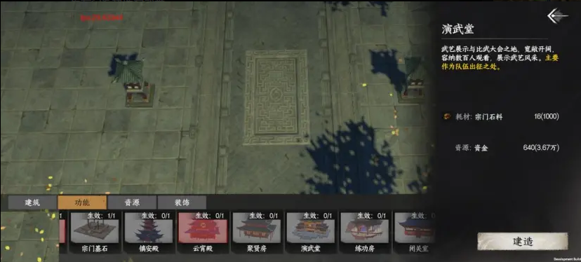 完成建造“宗门基石”后,可解锁建材、功能建筑、资源建筑、装饰的建造。资源建筑用于获取门派发展所需要的资源、功能建筑用户解锁更多的门派功能和玩法。