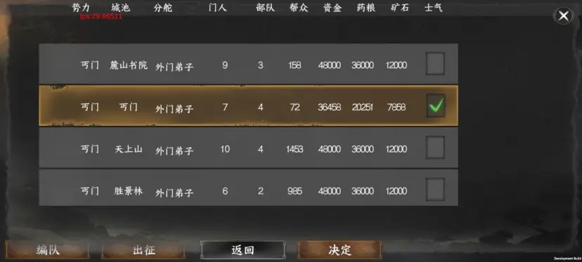 进入演武堂后,点击右上角“出征地”按钮,在这里可以选择派遣哪个据点的弟子出征。