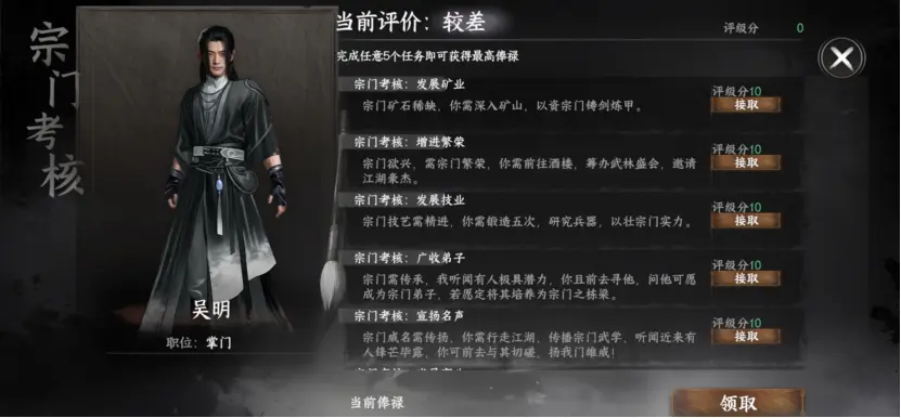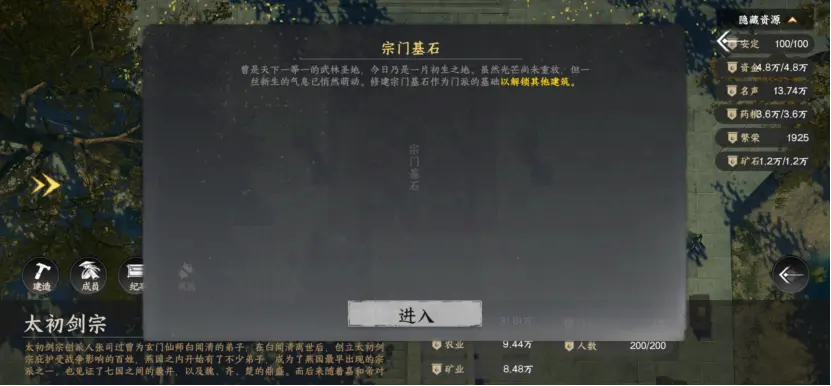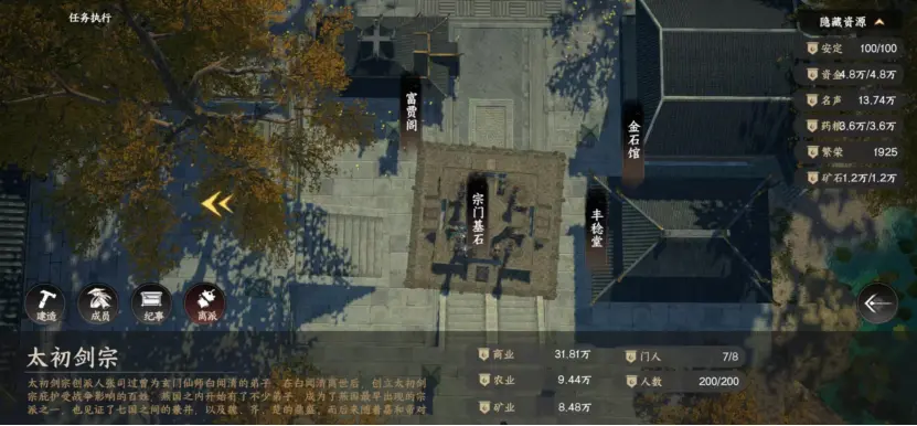 宗门基石:作为门派的基础,修建后可解锁其他建筑。事务总管会向掌门建议一些发展门派的事件,比如发展商业、发展农业、维持安定、招贤纳士等等。完成任务后可获得一些奖励以及提升宗门的评价。