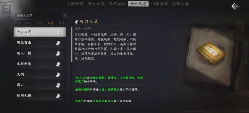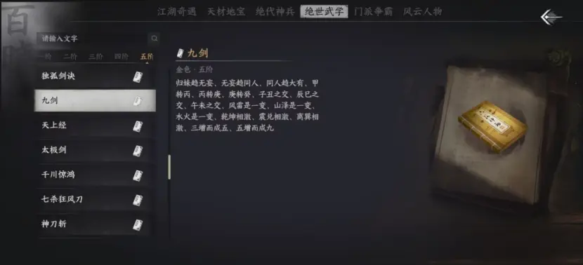 打开“江湖游记”页面内“绝世武学”一栏,可按阶层查看各类武学介绍。