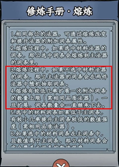 如上,图二框选中所述,开第三词条需要结合图中第3第4条来理解。第3条所述:熔炼过程中,不选中材料法器词条,则主法器的词条会在两件法器的词条中随机抽取,意味着熔炼过程中如果你不选中材料法器词条,一旦抽取到主法器词条,等于是这次熔炼熔了个寂寞,不会有新的词条挤进来,那么何来第三词条?开启第三词条相当于是用新的词条挤进来,莽出一条路来,如果选定✓词条,能不能成功先不说,比起不选中词条的熔,成功率起步时就要高出一倍往上。