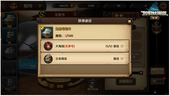 当船只碎片不足时,点击获取碎片按钮可前往大海战玩法获取船只碎片。