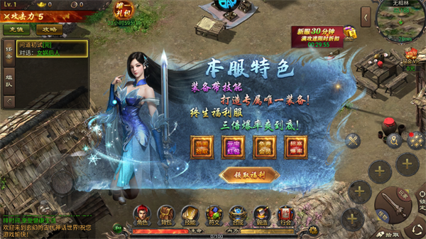 进入游戏先领取本服特色福利,享受装备带技能、终生福利服、三倍爆率权益,这是前期快速提升战力的关键,避免错过免费专属装备。