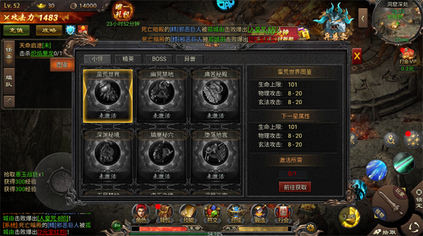 等级解锁后打开蛮荒世界图鉴,按指引收集激活异兽图鉴,每激活一个图鉴可永久提升生命、物理攻击、玄法攻击等属性,是前期战力提升的低成本捷径;点击“前往获取”可通过刷怪解锁对应异兽,高效完成激活。
