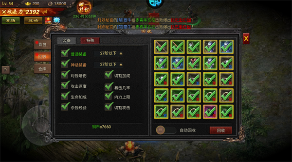 背包开启回收功能后,重点利用自动回收机制:勾选27阶以下普通、神话装备,开启自动回收,轻松获取对怪增伤、切割加成、攻击速度等核心属性;回收消耗少量铜币,能快速强化战力,助力刷怪打宝。